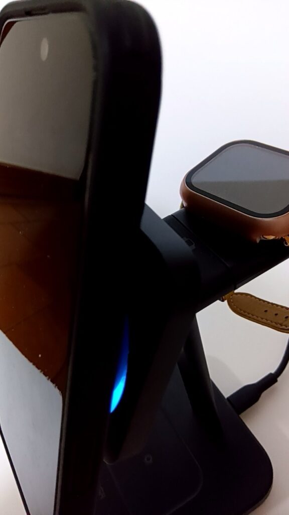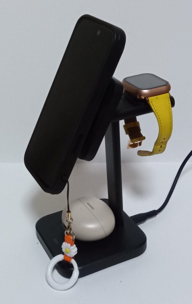 MagSafe(もしくは同等の機能)対応のスマートフォンを取り付けて充電ができ、その後ろ側でApple Watch充電、台座部分でワイヤレス充電に対応したイヤホンの充電ができます。
